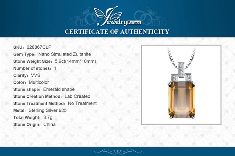 JewelryPalace 6ct Emerald Cut Nano Simulated Zultanite Color Change Diaspore Pendant Necklace 925 Sterling Silver Without Chain